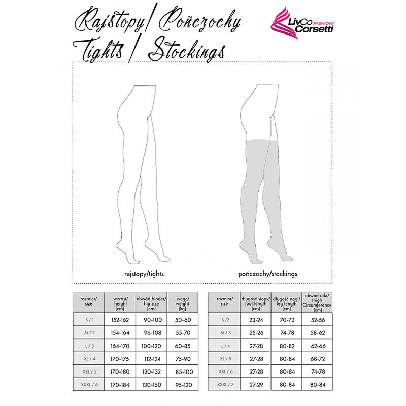 Las medias únicas de LivCo Corsetti fueron creadas para mujeres liberadas y seguras de sí mismas que no temen su atractivo sexual. Las medias son un elemento del guardarropa femenino que se robó el corazón de muchas mujeres y de otras personas. Destacan maravillosamente la belleza de las piernas de las mujeres y, al mismo tiempo, son sexys y encienden los sentidos. El modelo es una combinación de cinturón de encaje y medias que combina a la perfección con otros elementos de lencería erótica. Ropa interior para ocasiones especiales, así como para el día a día. El encaje en el muslo sin duda llamará la atención sobre las piernas. Son medias únicas que revelan una sorpresa sensual a su debido tiempo. Un modelo de ropa interior creado para auténticas tentadoras que quieren destacar. Las medias están fabricadas con un material duradero y de alta calidad, por lo que durarán mucho tiempo. Disponible en tallas S-L